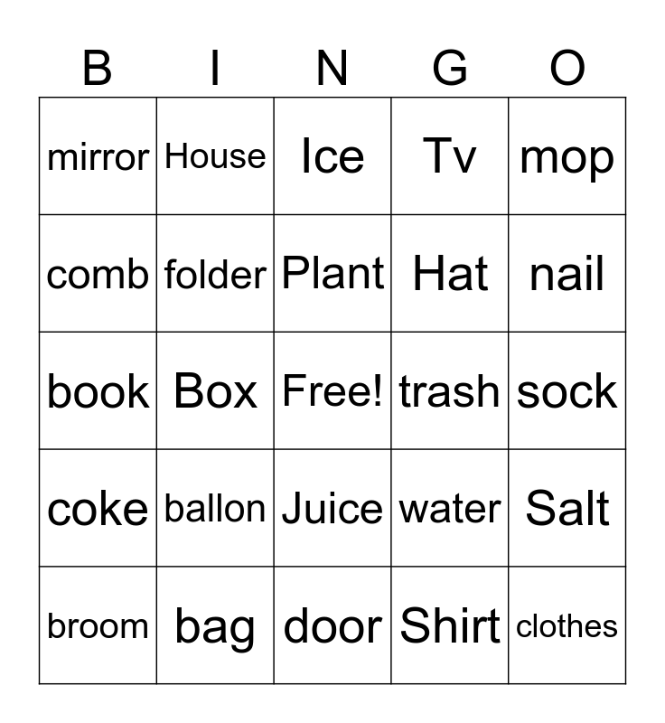 This bingo card has a free space and 24 words: ballon, bag, Plant, broom, mop, mirror, comb, House, trash, Juice, Hat, book, water, Salt, folder, Shirt, sock, Ice, nail, Box, clothes, coke, Tv and door.