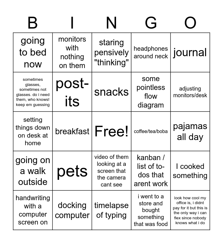 This bingo card has a free space and 33 words: skincare/hair product, lunch, breakfast, yoga, going on a walk outside, post-its, journal, handwriting with a computer screen on, monitors with nothing on them, standing desk is now standing, snacks, staring pensively "thinking", watering plants, shower/bath, coffee/tea/boba, adjusting monitors/desk, docking computer, setting things down on desk at home, pets, kanban / list of to-dos that arent work, video of them looking at a screen that the camera cant see, one side of a meeting that they probably shouldnt be recording without consent, going to bed now, pajamas all day, timelapse of typing, look how cool my office is, i didnt pay for it but this is the only way i can flex since nobody knows what i do, headphones around neck, some pointless flow diagram, sometimes glasses, sometimes not glasses. do i need them, who knows! keep em guessing, I cooked something, this is what it looks outside of a window, i went to a store and bought something that was food and curtains being opened.