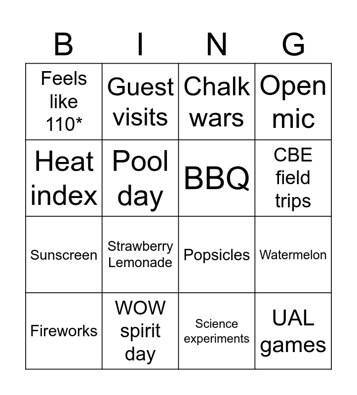 This bingo card has 24 words: Free!, Ice cream truck, CBE field trips, Raining during dismissal, Heat index, Feels like 110*, Pool day, Guest visits, WOW spirit day, Arts and crafts, Sunscreen, Popsicles, Slip n slide, Vacation, BBQ, Water balloon fights, Science experiments, Chalk wars, Strawberry Lemonade, Watermelon, Fireworks, UAL games, Open mic and Indoor lunch.