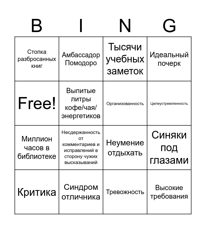 This bingo card has 16 words: Синдром отличника, Синяки под глазами, Тысячи учебных заметок, Стопка разбросанных книг, Миллион часов в библиотеке, Амбассадор Помодоро, Неумение отдыхать, Тревожность, Free!, Выпитые литры кофе/чая/энергетиков, Критика, Идеальный почерк, Несдержанность от комментариев и исправлений в сторону чужих высказываний, Целеустремленность, Организованность and Высокие требования.