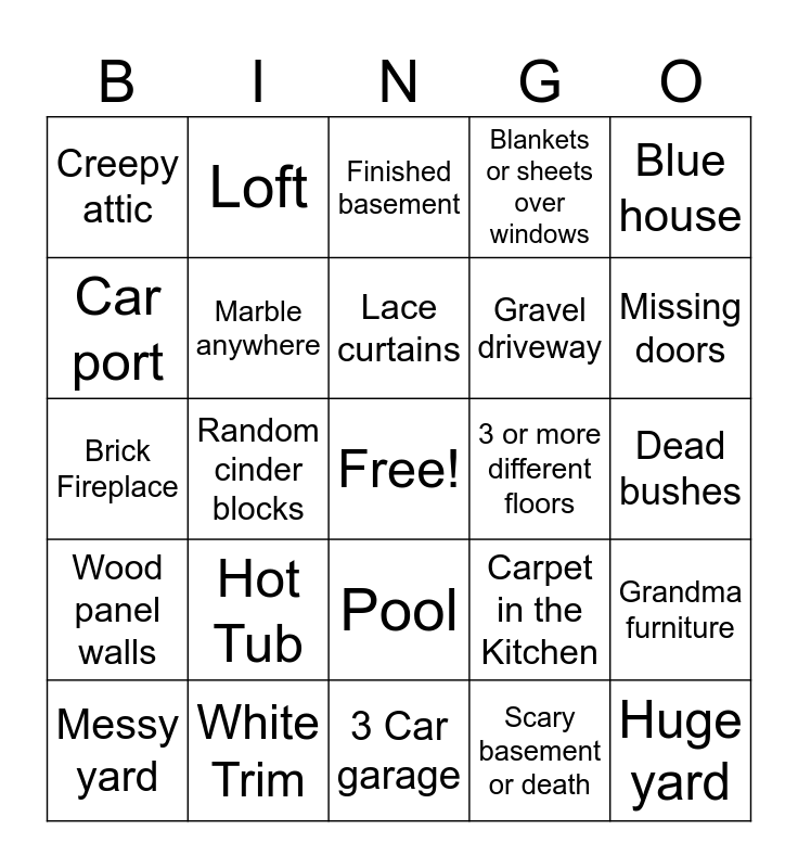 This bingo card has a free space and 44 words: Deadly basement stairs, Huge yard, No yard, Messy yard, Broken down cars in the yard, Scary basement or death, Finished basement, Flags Outside, Blue house, White Trim, Blankets or sheets over windows, 3 or more different floors, Pool, Hot Tub, Sauna, 3 Car garage, Mold, Brick Fireplace, Fridge in a weird place, Missing doors, Loft, Red door, Murder shed, Creepy attic, French doors, Dead bushes, Fun colored Toilet, Carpet in the bathroom, Carpet in the Kitchen, Wood panel walls, Walk in closet, Grandma furniture, Giant back porch, Chicken wire somewhere, Random cinder blocks, 70's carpet, Wallpaper, Vaulted ceilings, Lace curtains, Car port, Gravel driveway, Chopped wood, Marble anywhere and U shaped driveway.