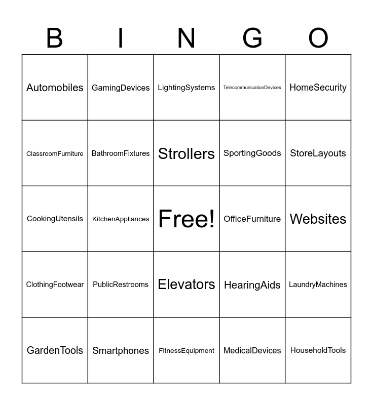 This bingo card has a free space and 30 words: Smartphones, RemoteControls, KitchenAppliances, PublicTransportation, Automobiles, LightingSystems, BathroomFixtures, Elevators, OfficeFurniture, FitnessEquipment, Websites, HouseholdTools, MedicalDevices, ChildrenToys, StoreLayouts, BankATMs, HearingAids, ClothingFootwear, PublicRestrooms, HomeSecurity, CookingUtensils, RecreationalEquipment, GamingDevices, SportingGoods, ClassroomFurniture, TelecommunicationDevices, LaundryMachines, GardenTools, Strollers and HospitalBeds.