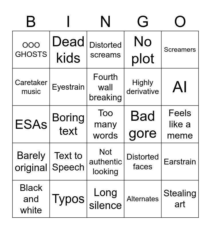 This bingo card has 25 words: Text to Speech, Long silence, Fourth wall breaking, Black and white, Screamers, OOO GHOSTS, Caretaker music, Dead kids, Bad gore, Not authentic looking, Highly derivative, ESAs, Distorted faces, Earstrain, Eyestrain, Stealing art, Feels like a meme, Distorted screams, AI, Boring text, Too many words, Typos, Barely original, No plot and Alternates.