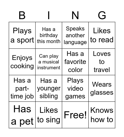 This bingo card has 17 words: Free!, Has a pet, Speaks another language, Plays a sport, Has a younger sibling, Likes to read, Wears glasses, Has a favorite color, Loves to travel, Can play a musical instrument, Likes to sing, Plays video games, Enjoys cooking, Has a birthday this month, Has a part-time job, Can drive a car and Knows how to.