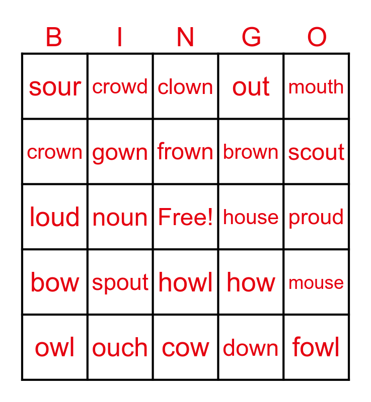 This bingo card has a free space and 27 words: how, now, brown, cow, crown, clown, crowd, bow, house, mouse, loud, out, owl, ouch, scout, town, gown, frown, spout, sour, proud, down, noun, fowl, howl, mouth and sound.