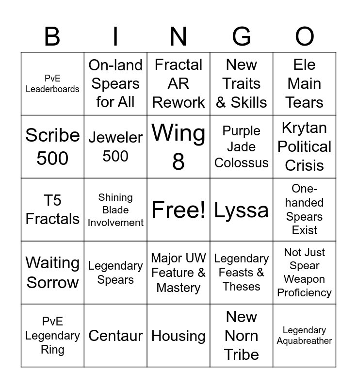 This bingo card has a free space and 24 words: Legendary Spears, Centaur, Wing 8, PvE Legendary Ring, Ele Main Tears, PvE Leaderboards, Scribe 500, On-land Spears for All, Lyssa, Major UW Feature & Mastery, Purple Jade Colossus, T5 Fractals, Legendary Feasts & Theses, Not Just Spear Weapon Proficiency, Jeweler 500, New Norn Tribe, One-handed Spears Exist, Fractal AR Rework, Krytan Political Crisis, Shining Blade Involvement, Legendary Aquabreather, Waiting Sorrow, New Traits & Skills and Housing.