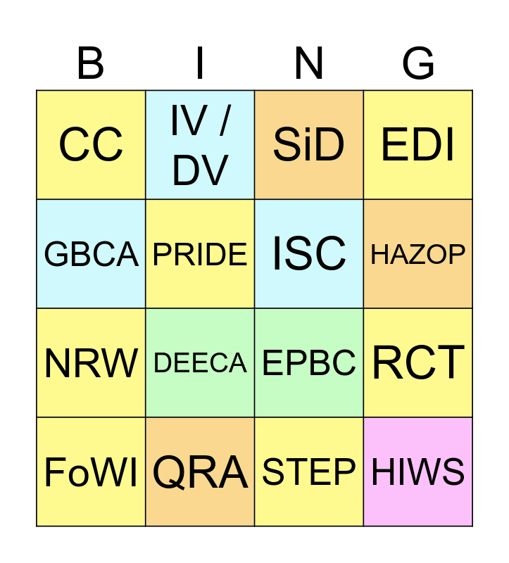 This bingo card has 34 words: FiSO 2.0, PLC, EMP, HITS, HIWS, ISC, GBCA, ESG, IV / DV, PAS2080, HAZOP, SiD, SIL, SESA, QRA, DEECA, DELWP, EPBC, EES, DTP, ECCS, LEPP, CC, STEP, CRM, FoWI, EDI, BIM, NRW, PRIDE, Diversify, RCT, PCM and LOC200.