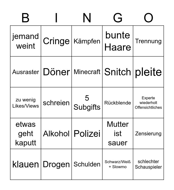 This bingo card has a free space and 24 words: Alkohol, Drogen, Minecraft, klauen, Trennung, jemand weint, Ausraster, Cringe, Rückblende, Polizei, Snitch, zu wenig Likes/Views, Mutter ist sauer, Zensierung, Döner, Schwarz/Weiß + Slowmo, Experte wiederholt Offensichtliches, Kämpfen, pleite, schreien, schlechter Schauspieler, etwas geht kaputt, bunte Haare and Schulden.