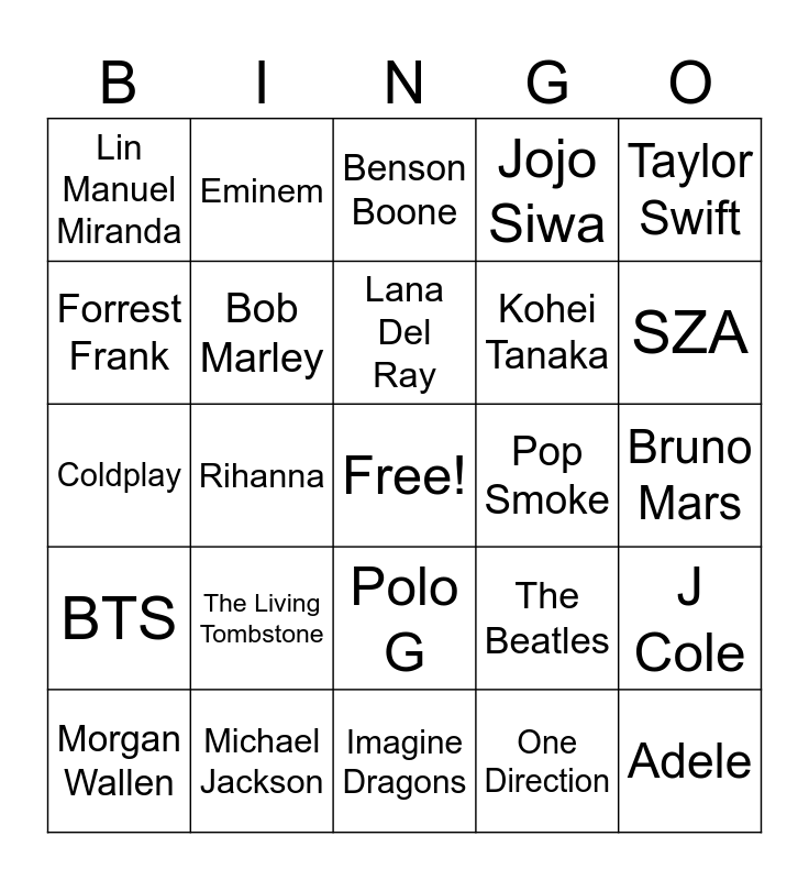 This bingo card has a free space and 24 words: The Living Tombstone, Michael Jackson, Lana Del Ray, Morgan Wallen, Taylor Swift, Lin Manuel Miranda, Forrest Frank, Eminem, Pop Smoke, Polo G, Kohei Tanaka, Coldplay, The Beatles, J Cole, Bob Marley, One Direction, Bruno Mars, Benson Boone, SZA, Rihanna, Adele, BTS, Jojo Siwa and Imagine Dragons.