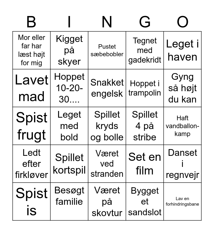 This bingo card has a free space and 24 words: Spillet kortspil, Besøgt familie, Snakket engelsk, Spist is, Leget i haven, Mor eller far har læst højt for mig, Lavet mad, Kigget på skyer, Spillet 4 på stribe, Været ved stranden, Hoppet i trampolin, Spist frugt, Set en film, Danset i regnvejr, Hoppet 10-20-30...., Bygget et sandslot, Haft vandballon- kamp, Pustet sæbebobler, Gyng så højt du kan, Leget med bold, Lav en forhindringsbane, Ledt efter firkløver, Tegnet med gadekridt and Været på skovtur.