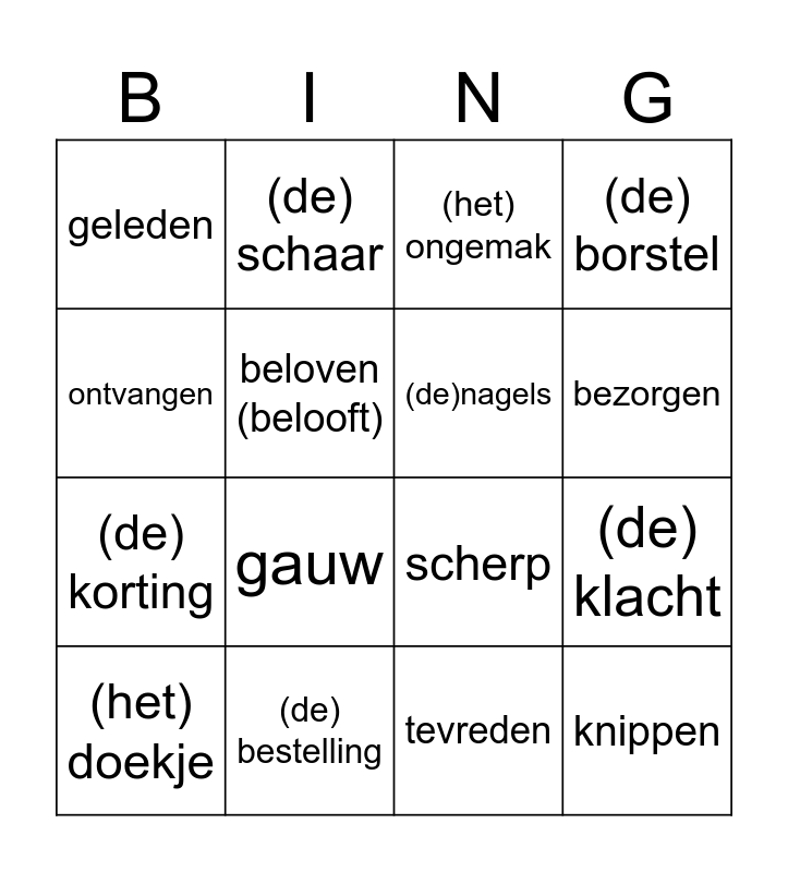This bingo card has 16 words: (de) bestelling, (de) klacht, (het) ongemak, geleden, (de) korting, (de) schaar, scherp, tevreden, ontvangen, beloven (belooft), (het) doekje, (de) borstel, gauw, bezorgen, (de)nagels and knippen.