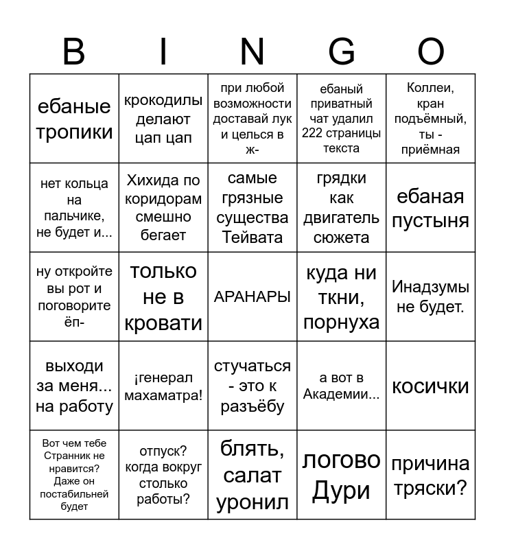 This bingo card has a free space and 24 words: ¡генерал махаматра!, отпуск? когда вокруг столько работы?, самые грязные существа Тейвата, Вот чем тебе Странник не нравится? Даже он постабильней будет, Коллеи, кран подъёмный, ты - приёмная, ебаные тропики, нет кольца на пальчике, не будет и..., крокодилы делают цап цап, куда ни ткни, порнуха, стучаться - это к разъёбу, грядки как двигатель сюжета, ну откройте вы рот и поговорите ёп-, а вот в Академии..., косички, Хихида по коридорам смешно бегает, логово Дури, Инадзумы не будет., при любой возможности доставай лук и целься в ж-, ебаная пустыня, только не в кровати, причина тряски?, выходи за меня... на работу, ебаный приватный чат удалил 222 страницы текста and блять, салат уронил.