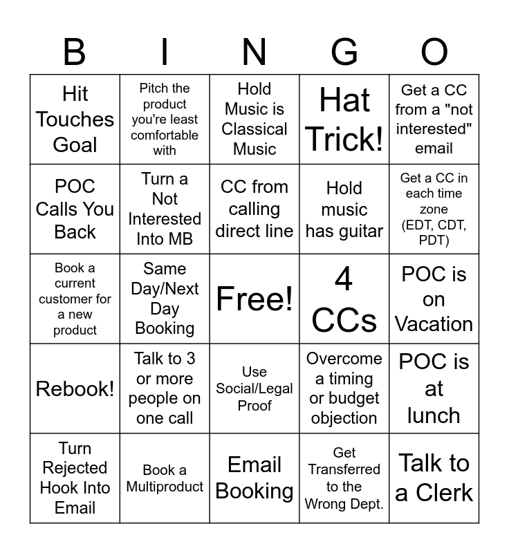 This bingo card has a free space and 29 words: Turn Rejected Hook Into Email, Make the POC Laugh, Same Day/Next Day Booking, Get Hung Up On, Hit Touches Goal, Hold Music is Classical Music, Turn a Not Interested Into MB, Talk to 3 or more people on one call, 4 CCs, Book a Multiproduct, POC is on Vacation, Talk to a Clerk, Email Booking, Get Transferred to the Wrong Dept., Get a CC in each time zone (EDT, CDT, PDT), Use Feel, Felt, Found, Use Social/Legal Proof, Rebook!, Get a CC from a "not interested" email, Book a current customer for a new product, Overcome a timing or budget objection, Find out if/where the poc is going on vacation, Hold music has guitar, POC Calls You Back, Hat Trick!, Pitch the product you're least comfortable with, POC is at lunch, CC from calling direct line and POC is in a good mood.