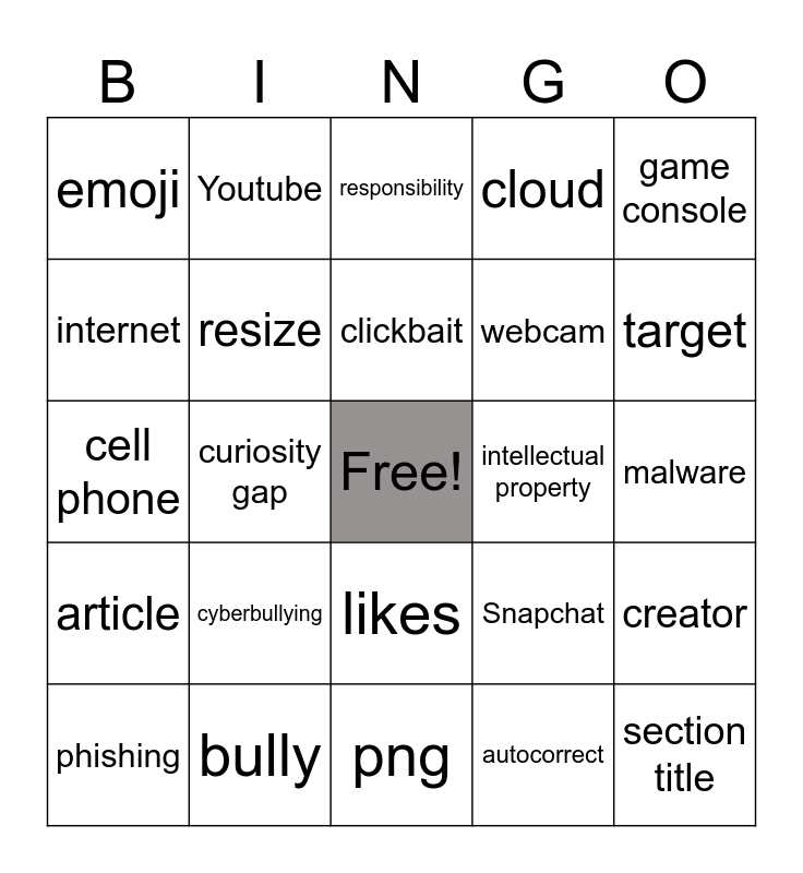 This bingo card has a free space and 126 words: advertising, alter, Apple, appropriate, apps, arrow, article, attribute, autocorrect, backspace, balance, benefit, bias, blog, Bluetooth, browsing, bully, byline, bystander, capslock, case, cell phone, charge, chat, citizenship, clickbait, cloud, comments, communicate, copyright, creator, crop, curiosity gap, cyberbullying, delete, desktop, device, digital, download, email, emoji, empathy, error, evidence, Facebook, fact-check, footprint, game console, gif, Google, griefing, headline, history, hyperlinks, identify, image, incognito, inference, insert, intellectual property, internet, interpret, IRL, jpeg, keyboard, laptop, license, likes, lurking, malware, manipulate, media, meme, message, Microsoft, mislead, mouse, netiquette, non-digital, number pad, offline, online, personal, persuade, phishing, photoshop, pin, plagiarism, png, post, privacy, related articles, reload, resize, respectful, responsibility, retouching, reverse image search, risk, screenshot, section title, smartwatch, Snapchat, social interaction, sponsored content, stereotypes, tablet, tagged, target, text, Tiktok, tweet, update, upload, upstander, URL, videochat, virus, vlog, VR, webcam, wifi, Windows, wireless, Youtube and zoom.