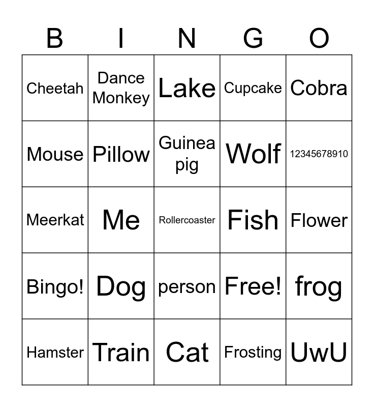 This bingo card has 25 words: Dog, Cat, Guinea pig, Hamster, Cobra, Cheetah, Mouse, Dance Monkey, Fish, person, Wolf, Meerkat, Free!, frog, Pillow, UwU, Flower, Lake, 12345678910, Me, Rollercoaster, Train, Bingo!, Cupcake and Frosting.