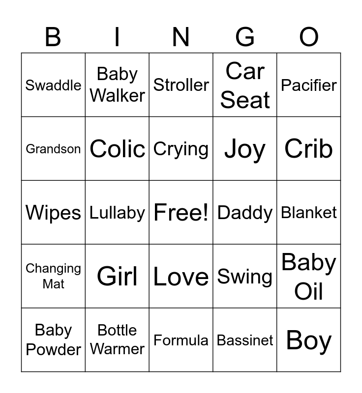 This bingo card has a free space and 69 words: Bottle, Blanket, Newborn, Baby Lotion, Bottle Warmer, Diapers, Car Seat, Baby, Pacifier, Birth, Baby Oil, Milk, Swaddle, Stroller, Bundle, Lullaby, Love, Joy, Toys, Changing Mat, Daddy, Swing, Crib, Booties, Highchair, Mommy, Onesies, Pillow, Bassinet, Sippy Cup, Baby Walker, Baby Shampoo, Wash Cloth, Pink, Blue, Ultrasound, Baby Carrier, Nursery Rhyme, Grandson, Granddaughter, Girl, Boy, Nursery, Bath Time, Toddler, Baby Powder, Hooded Towel, Infant, Teether, Colic, Crying, Stork, Security Blanket, Formula, Baby Book, Play Gym, Rattle, Diaper Pin, Playpen, Wipes, Bib, Gerber, Huggies, Baby Food, Baby Monito, Teddy Bear, Bonnet, Bouncy Seat and Breast Pump.