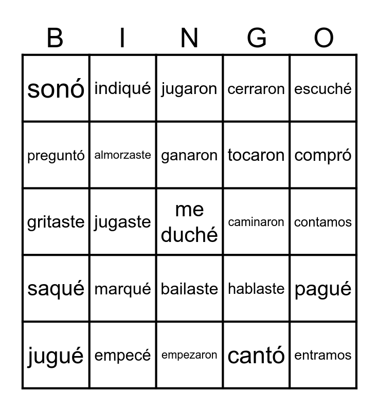 This bingo card has a free space and 24 words: marqué, empecé, ganaron, jugué, escuché, sonó, preguntó, indiqué, caminaron, bailaste, tocaron, gritaste, hablaste, pagué, almorzaste, cantó, contamos, jugaron, compró, jugaste, entramos, saqué, cerraron and empezaron.