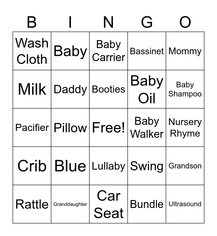 This bingo card has a free space and 36 words: Joy, Toys, Changing Mat, Daddy, Swing, Crib, Booties, Highchair, Mommy, Onesies, Pillow, Bassinet, Sippy Cup, Baby Walker, Baby Shampoo, Wash Cloth, Pink, Blue, Ultrasound, Baby Carrier, Nursery Rhyme, Grandson, Granddaughter, Rattle, Car Seat, Baby, Pacifier, Birth, Baby Oil, Milk, Swaddle, Stroller, Bundle, Lullaby, Love and Nursery.