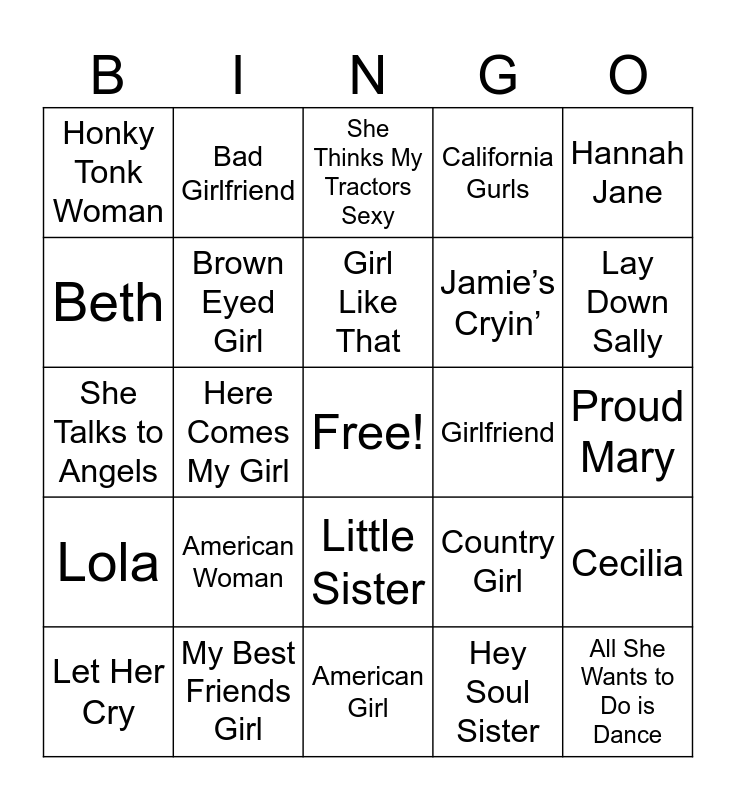 This bingo card has a free space and 49 words: Alison, All She Wants to Do is Dance, Allison Road, American Girl, American Woman, Are You Gonna Be My Girl, Bad Girlfriend, Beautiful Girls, Beth, Breaking the Girl, Brown Eyed Girl, California Gurls, Cecilia, Country Girl, Eleanor Rigby, Fell in Love with A Girl, Girl Like That, Girlfriend, Girls, Hannah Jane, Here Comes My Girl, Hey Soul Sister, Honky Tonk Woman, Jamie’s Cryin’, Angie, Lay Down Sally, Let Her Cry, Listen to Her Heart, Little Sister, Lola, Look at Little Sister, Mary Jane’s Last Dance, Mary Mary, Mrs Robinson, My Best Friends Girl, No Woman No Cry, Pretty Woman, Peggy Sue, Proud Mary, Put a Girl in It, Rock and Roll Girls, Rosalita, Roxanne, She Sells Sanctuary, She Talks to Angels, She Thinks My Tractors Sexy, Sheena is a Punk Rocker, Sweet Caroline and Sweet Jane.