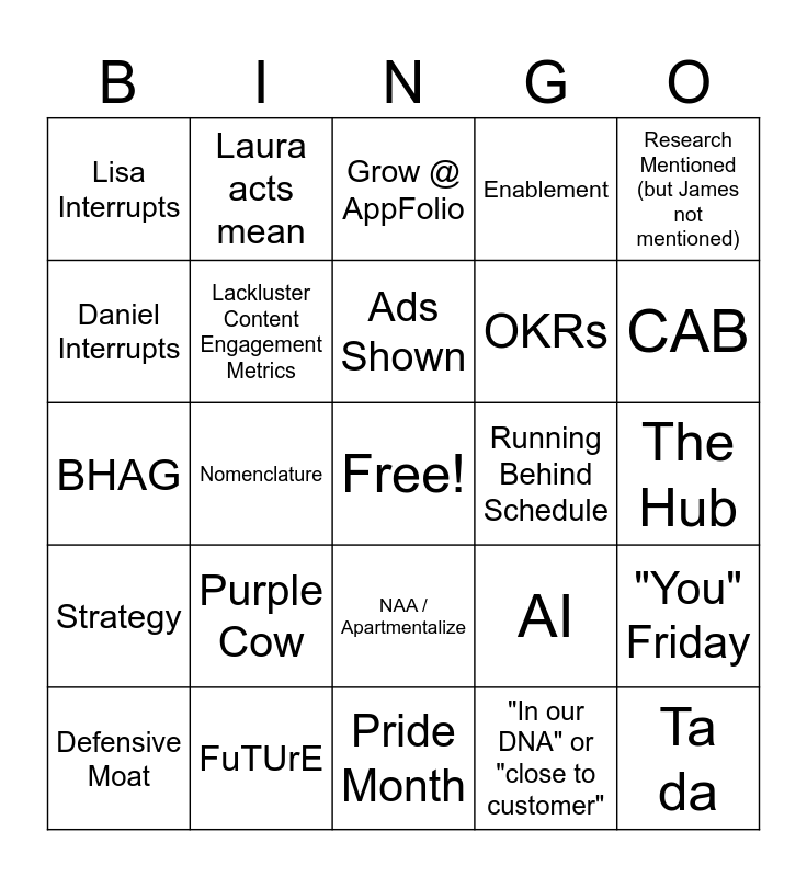 This bingo card has a free space and 24 words: Purple Cow, FuTUrE, Ads Shown, Defensive Moat, Research Mentioned (but James not mentioned), Lisa Interrupts, Daniel Interrupts, Laura acts mean, Running Behind Schedule, NAA / Apartmentalize, OKRs, BHAG, AI, "You" Friday, Lackluster Content Engagement Metrics, "In our DNA" or "close to customer", The Hub, Grow @ AppFolio, CAB, Nomenclature, Ta da, Strategy, Enablement and Pride Month.