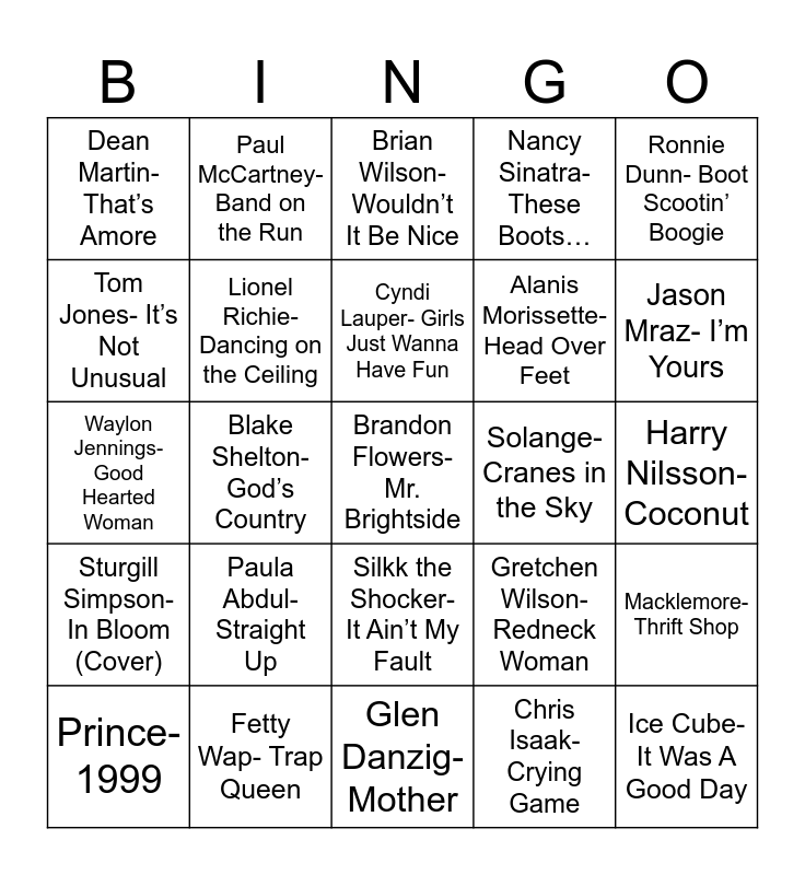 This bingo card has 29 words: Prince-1999, Marky Mark- Good Vibrations, Blake Shelton- God’s Country, Ice Cube- It Was A Good Day, Dean Martin- That’s Amore, Brian Wilson- Wouldn’t It Be Nice, Lionel Richie- Dancing on the Ceiling, Paula Abdul- Straight Up, Solange-Cranes in the Sky, Fetty Wap- Trap Queen, Harry Nilsson- Coconut, Brandon Flowers- Mr. Brightside, Glen Danzig- Mother, Chris Isaak- Crying Game, Jason Mraz- I’m Yours, Ray LaMontagne- You Are The Best Thing, Silkk the Shocker- It Ain’t My Fault, Sturgill Simpson- In Bloom (Cover), Ronnie Dunn- Boot Scootin’ Boogie, Waylon Jennings- Good Hearted Woman, Gretchen Wilson- Redneck Woman, Lana Del Rey- Summertime Sadness, Alanis Morissette- Head Over Feet, Tom Jones- It’s Not Unusual, Nancy Sinatra- These Boots…, Paul McCartney-Band on the Run, Macklemore-Thrift Shop, Cyndi Lauper- Girls Just Wanna Have Fun and Chino Moreno- Change (In The House of Flies).