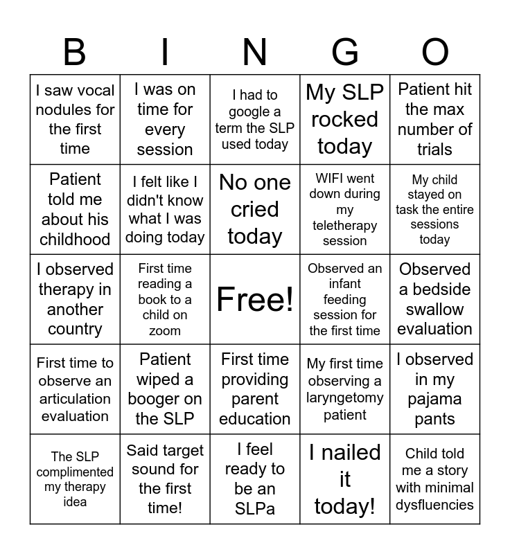 This bingo card has a free space and 24 words: Patient wiped a booger on the SLP, Said target sound for the first time!, No one cried today, The SLP complimented my therapy idea, Patient hit the max number of trials, I saw vocal nodules for the first time, Patient told me about his childhood, I was on time for every session, Observed an infant feeding session for the first time, First time providing parent education, WIFI went down during my teletherapy session, I observed therapy in another country, My first time observing a laryngetomy patient, I observed in my pajama pants, I felt like I didn't know what I was doing today, I nailed it today!, Observed a bedside swallow evaluation, I had to google a term the SLP used today, My child stayed on task the entire sessions today, First time reading a book to a child on zoom, Child told me a story with minimal dysfluencies, First time to observe an articulation evaluation, My SLP rocked today and I feel ready to be an SLPa.