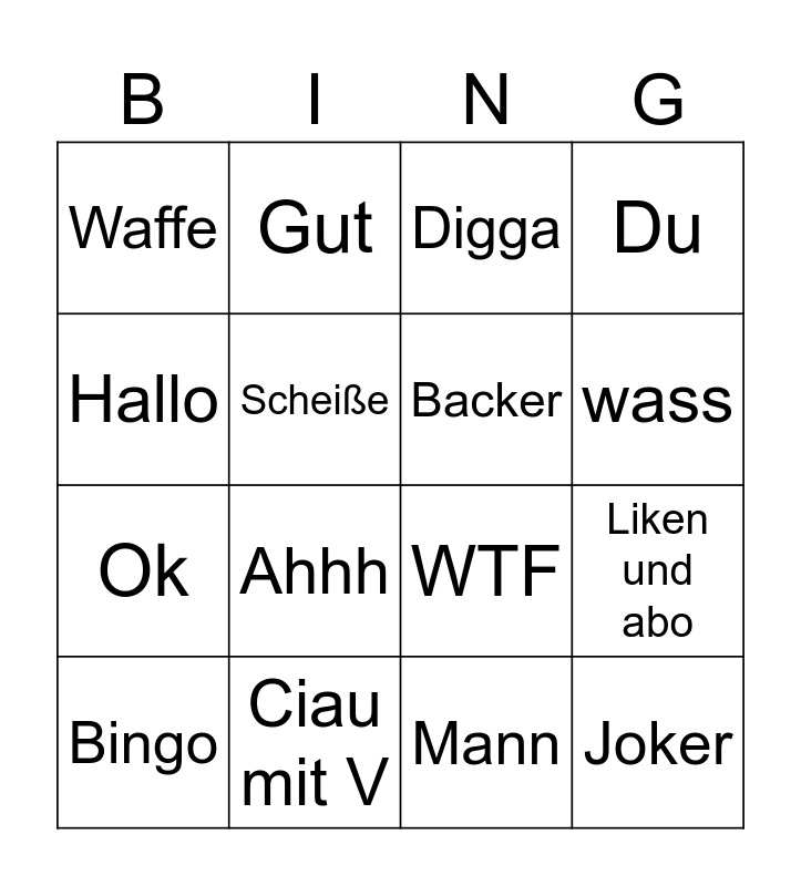 This bingo card has 16 words: Ciau mit V, Liken und abo, Digga, Waffe, Ok, Gut, WTF, Mann, Hallo, Scheiße, Bingo, Du, Ahhh, wass, Backer and Joker.