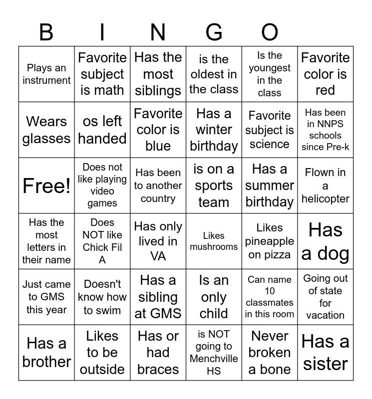 This bingo card has 36 words: Is an only child, Has a sibling at GMS, is NOT going to Menchville HS, Wears glasses, Has the most letters in their name, is on a sports team, os left handed, Has or had braces, Is the youngest in the class, Can name 10 classmates in this room, Has been in NNPS schools since Pre-k, is the oldest in the class, Going out of state for vacation, Does not like playing video games, Has a winter birthday, Plays an instrument, Just came to GMS this year, Has a summer birthday, Free!, Has the most siblings, Has been to another country, Does NOT like Chick Fil A, Likes mushrooms, Has only lived in VA, Likes pineapple on pizza, Favorite subject is math, Favorite subject is science, Likes to be outside, Favorite color is blue, Favorite color is red, Has a sister, Has a brother, Has a dog, Flown in a helicopter, Doesn't know how to swim and Never broken a bone.