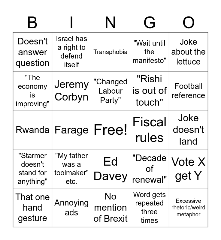 This bingo card has a free space and 24 words: "My father was a toolmaker" etc., Annoying ads, "Changed Labour Party", That one hand gesture, Joke about the lettuce, Doesn't answer question, "The economy is improving", Israel has a right to defend itself, Fiscal rules, Ed Davey, "Rishi is out of touch", Rwanda, "Decade of renewal", Vote X get Y, Jeremy Corbyn, Word gets repeated three times, Joke doesn't land, Transphobia, Football reference, Farage, Excessive rhetoric/weird metaphor, "Starmer doesn't stand for anything", "Wait until the manifesto" and No mention of Brexit.
