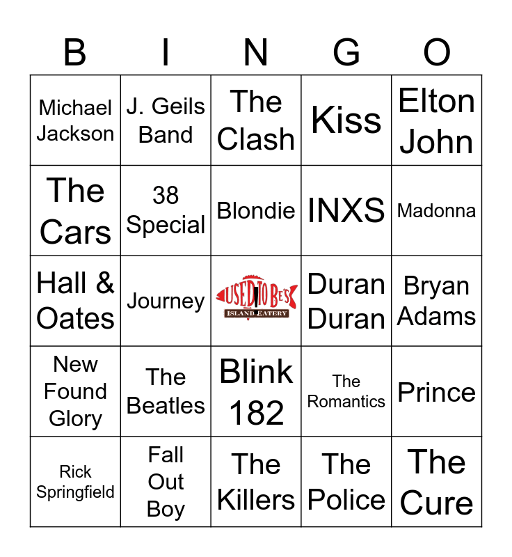 This bingo card has a free space and 29 words: Rick Springfield, Eddie Money, Journey, Billy Joel, Michael Jackson, The Clash, 38 Special, The Beatles, Duran Duran, Fall Out Boy, Bryan Adams, The Cure, The Killers, The Police, Madonna, Bowling For Soup, Blink 182, New Found Glory, Elton John, Hall & Oates, The Romantics, The Eagles, INXS, The Cars, Kiss, J. Geils Band, Prince, Blondie and Bruce Springsteen.