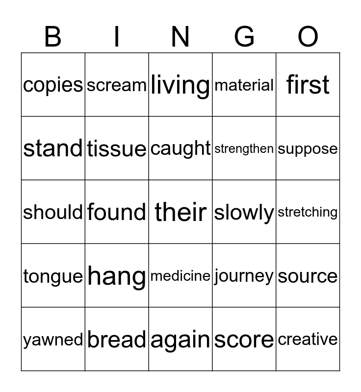 This bingo card has a free space and 24 words: hang, bread, caught, yawned, first, copies, stand, scream, slowly, medicine, strengthen, should, journey, source, tissue, score, stretching, living, suppose, found, creative, tongue, material and again.