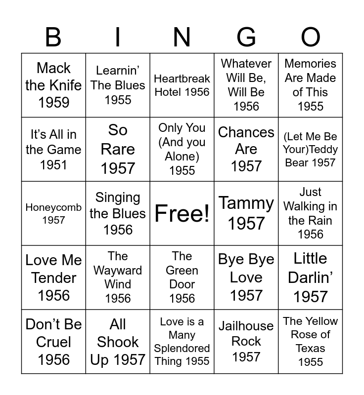 This bingo card has a free space and 29 words: Don’t Be Cruel 1956, Rock Around the Clock 1954, Singing the Blues 1956, Love Letters in the Sand 1957, Mack the Knife 1959, Heartbreak Hotel 1956, So Rare 1957, The Wayward Wind 1956, Tammy 1957, All Shook Up 1957, Just Walking in the Rain 1956, The Yellow Rose of Texas 1955, Love is a Many Splendored Thing 1955, Jailhouse Rock 1957, (Let Me Be Your)Teddy Bear 1957, Sixteen Tons 1955, The Green Door 1956, Love Me Tender 1956, Memories Are Made of This 1955, Honeycomb 1957, Bye Bye Love 1957, Searchin’ 1957, Chances Are 1957, It’s All in the Game 1951, Whatever Will Be, Will Be 1956, Learnin’ The Blues 1955, Little Darlin’ 1957, Only You (And you Alone) 1955 and At the Hop 1957.