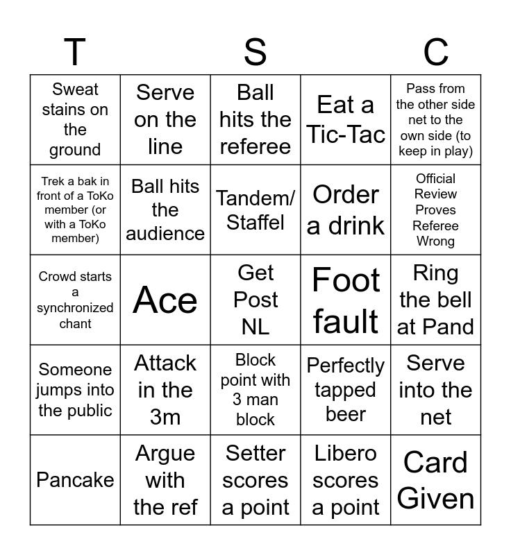 This bingo card has 29 words: Pancake, Killer Block, Ace, Card Given, Sweat stains on the ground, Ball hits the referee, Ball hits the audience, Attack in the 3m, Foot fault, Argue with the ref, Ring the bell at Pand, Get Post NL, Setter scores a point, Libero scores a point, Official Review Proves Referee Wrong, Line Fault, Block point with 3 man block, Someone jumps into the public, Pass from the other side net to the own side (to keep in play), Crowd starts a synchronized chant, Perfectly tapped beer, Play and win Tic-Tac-Toe against a ToKo member, Order a drink, Trek a bak in front of a ToKo member (or with a ToKo member), Eat a Tic-Tac, Serve on the line, Serve into the net, Tandem/ Staffel and Double tapped.
