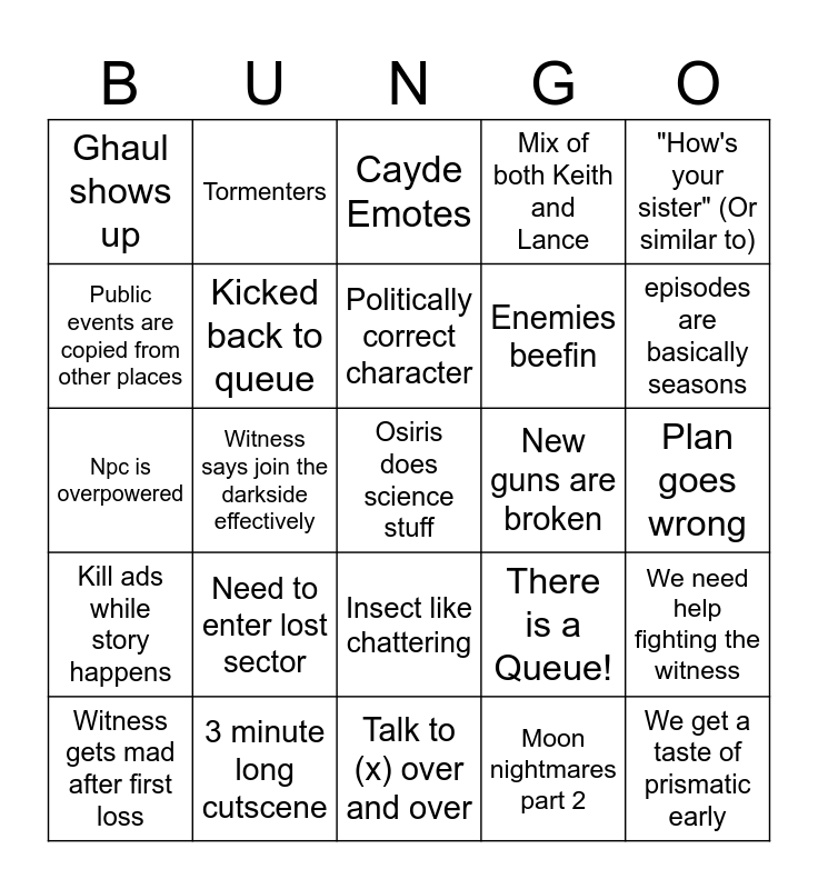This bingo card has 25 words: Need to enter lost sector, Talk to (x) over and over, Politically correct character, Witness gets mad after first loss, "How's your sister" (Or similar to), Ghaul shows up, Public events are copied from other places, Tormenters, New guns are broken, Insect like chattering, Enemies beefin, Npc is overpowered, There is a Queue!, We need help fighting the witness, Kicked back to queue, We get a taste of prismatic early, Plan goes wrong, Cayde Emotes, episodes are basically seasons, Witness says join the darkside effectively, Osiris does science stuff, 3 minute long cutscene, Kill ads while story happens, Mix of both Keith and Lance and Moon nightmares part 2.