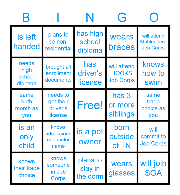 This bingo card has a free space and 24 words: knows admissions counselor name, knows someone in Job Corps, has driver's license, knows their trade choice, will attend Muhlenberg Job Corps, is left handed, needs high school diploma, plans to be non-residential, has 3 or more siblings, is a pet owner, will attend HOOKS Job Corps, same birth month as you, born outside of TN, will commit to Job Corps, brought all enrollment documents, wears glasses, same trade choice as you, has high school diploma, knows how to swim, needs to get their driver's license, will join SGA, is an only child, wears braces and plans to stay in the dorm.