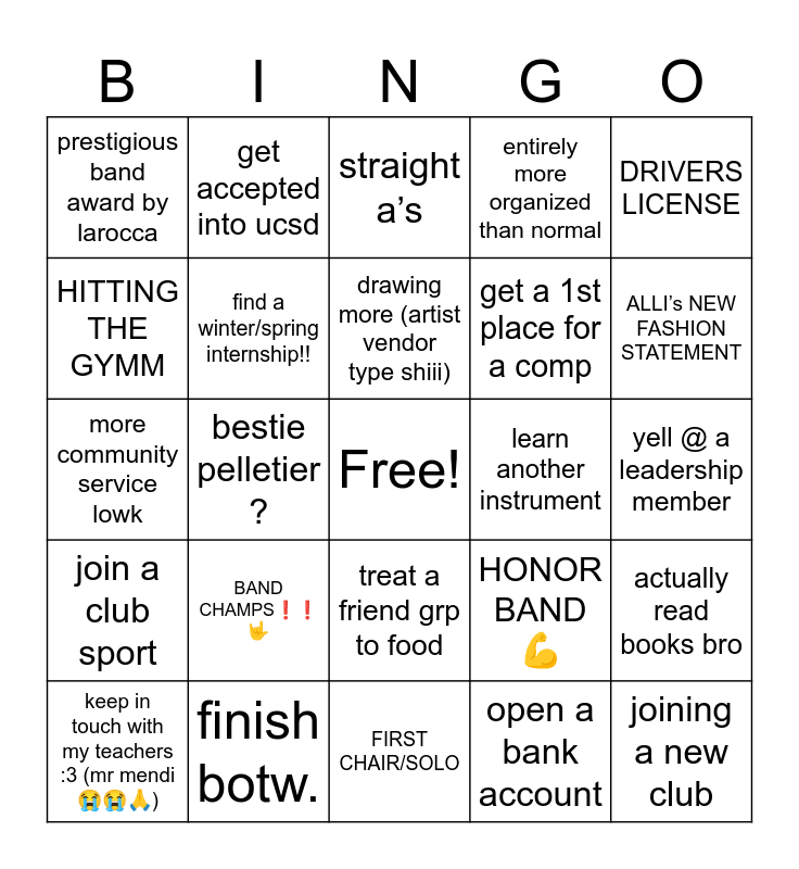 This bingo card has a free space and 24 words: BAND CHAMPS❗️❗️🤟, finish botw., drawing more (artist vendor type shiii), keep in touch with my teachers :3 (mr mendi 😭😭🙏), DRIVERS LICENSE, prestigious band award by larocca, HITTING THE GYMM, get accepted into ucsd, learn another instrument, treat a friend grp to food, get a 1st place for a comp, more community service lowk, HONOR BAND 💪, actually read books bro, find a winter/spring internship!!, open a bank account, yell @ a leadership member, straight a’s, ALLI’s NEW FASHION STATEMENT, bestie pelletier ?, joining a new club, join a club sport, entirely more organized than normal and FIRST CHAIR/SOLO.