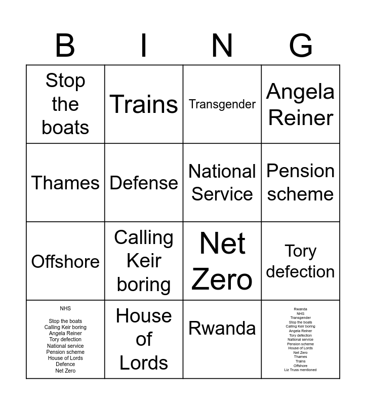 This bingo card has 17 words: Rwanda, NHS Stop the boats Calling Keir boring Angela Reiner Tory defection National service Pension scheme House of Lords Defence Net Zero, Transgender, Stop the boats, Calling Keir boring, Angela Reiner, Tory defection, National Service, Pension scheme, Defense, House of Lords, Net Zero, Thames, Trains, Offshore, Liz Truss mentioned and Rwanda NHS Transgender Stop the boats Calling Keir boring Angela Reiner Tory defection National service Pension scheme House of Lords Net Zero Thames Trains Offshore Liz Truss mentioned.
