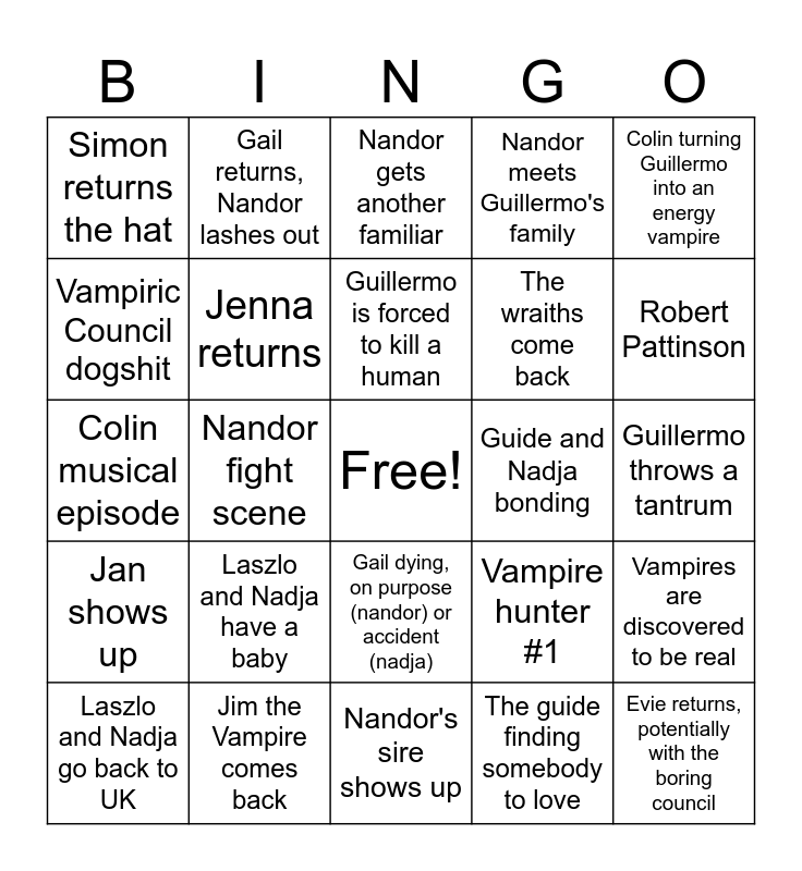 This bingo card has a free space and 24 words: Laszlo and Nadja have a baby, Jim the Vampire comes back, Guillermo is forced to kill a human, Laszlo and Nadja go back to UK, Colin turning Guillermo into an energy vampire, Simon returns the hat, Vampiric Council dogshit, Gail returns, Nandor lashes out, Guide and Nadja bonding, Gail dying, on purpose (nandor) or accident (nadja), The wraiths come back, Colin musical episode, Vampire hunter #1, Vampires are discovered to be real, Jenna returns, The guide finding somebody to love, Guillermo throws a tantrum, Nandor gets another familiar, Robert Pattinson, Nandor fight scene, Evie returns, potentially with the boring council, Jan shows up, Nandor meets Guillermo's family and Nandor's sire shows up.