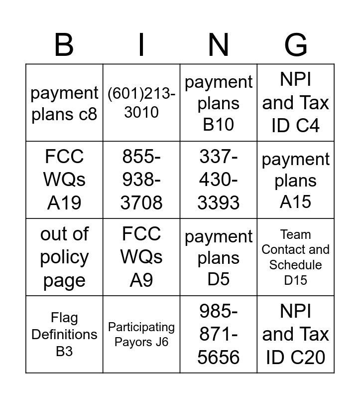 This bingo card has 21 words: Participating Payors J6, Participating Payors C22, (601)213-3010, 903-577-6146, 985-871-5656, 337-430-3393, payment plans c8, payment plans B10, payment plans D5, payment plans A15, out of policy page, NPI and Tax ID C4, NPI and Tax ID C20, Ready - Not Ready Uses B9, 855-938-3708, Care Credit 8A, Flag Definitions B3, FCC WQs A9, FCC WQs A19, Team Contact and Schedule D15 and Team Contact and Schedule C7.