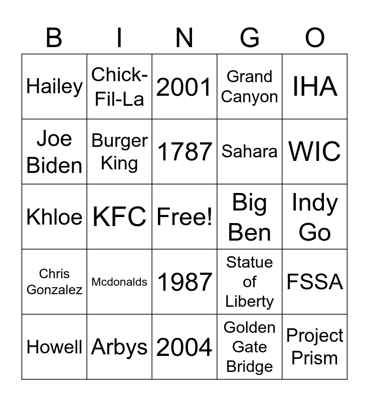 This bingo card has a free space and 24 words: Howell, Mcdonalds, 1787, Golden Gate Bridge, IHA, Hailey, Chick-Fil-La, 2001, Big Ben, Indy Go, Khloe, Burger King, Statue of Liberty, FSSA, Joe Biden, Arbys, 2004, Grand Canyon, WIC, Chris Gonzalez, KFC, 1987, Sahara and Project Prism.