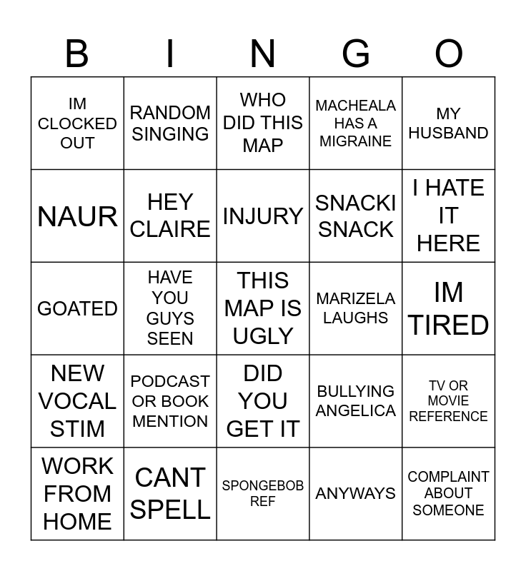 This bingo card has a free space and 24 words: PODCAST OR BOOK MENTION, CANT SPELL, INJURY, WORK FROM HOME, MY HUSBAND, IM CLOCKED OUT, NAUR, RANDOM SINGING, MARIZELA LAUGHS, DID YOU GET IT, SNACKI SNACK, GOATED, BULLYING ANGELICA, TV OR MOVIE REFERENCE, HEY CLAIRE, ANYWAYS, IM TIRED, WHO DID THIS MAP, I HATE IT HERE, HAVE YOU GUYS SEEN, COMPLAINT ABOUT SOMEONE, NEW VOCAL STIM, MACHEALA HAS A MIGRAINE and SPONGEBOB REF.