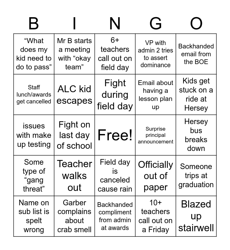 This bingo card has a free space and 24 words: Teacher walks out, Garber complains about crab smell, Fight during field day, Name on sub list is spelt wrong, Backhanded email from the BOE, “What does my kid need to do to pass”, Staff lunch/awards get cancelled, Mr B starts a meeting with “okay team”, Surprise principal announcement, Field day is canceled cause rain, Email about having a lesson plan up, issues with make up testing, Officially out of paper, Someone trips at graduation, ALC kid escapes, 10+ teachers call out on a Friday, Hersey bus breaks down, 6+ teachers call out on field day, Kids get stuck on a ride at Hersey, Fight on last day of school, Blazed up stairwell, Some type of “gang threat”, VP with admin 2 tries to assert dominance and Backhanded compliment from admin at awards.