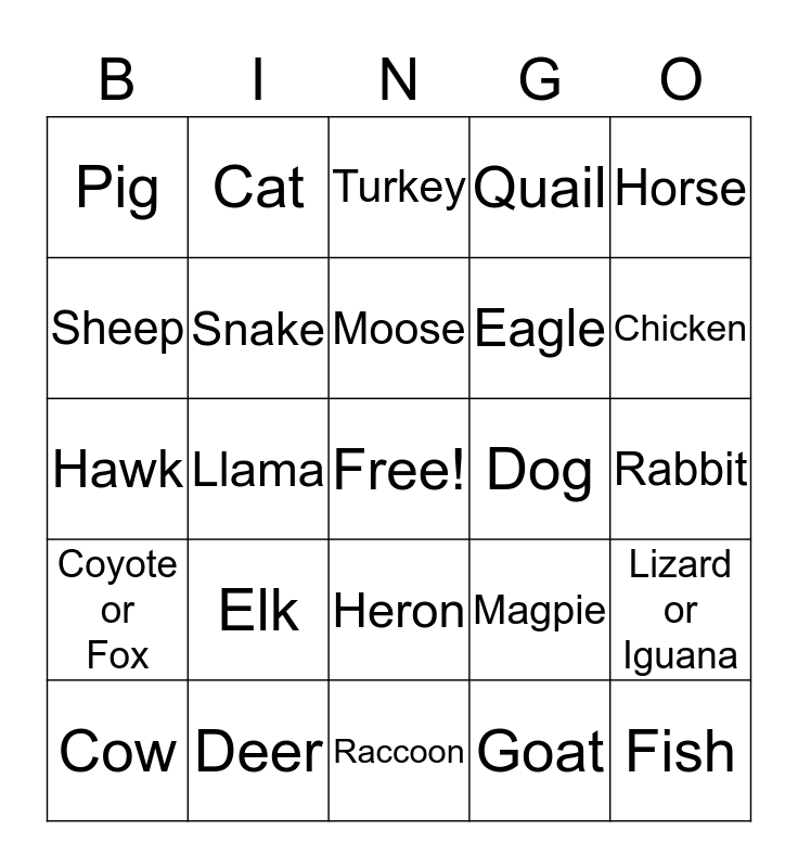 This bingo card has a free space and 24 words: Elk, Deer, Moose, Cow, Horse, Pig, Sheep, Cat, Dog, Heron, Eagle, Hawk, Magpie, Lizard or Iguana, Snake, Goat, Rabbit, Turkey, Chicken, Llama, Fish, Coyote or Fox, Quail and Raccoon.