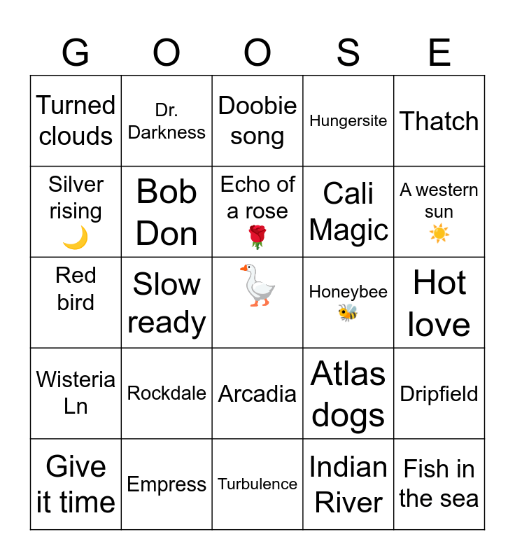 This bingo card has a free space and 24 words: Rockdale, Empress, Echo of a rose ๐น, Give it time, Thatch, Turned clouds, Silver rising ๐, Dr. Darkness, Honeybee ๐, Arcadia, Cali Magic, Red bird, Atlas dogs, Dripfield, Bob Don, Indian River, Hot love, Doobie song, A western sun โ๏ธ, Slow ready, Fish in the sea, Wisteria Ln, Hungersite and Turbulence.