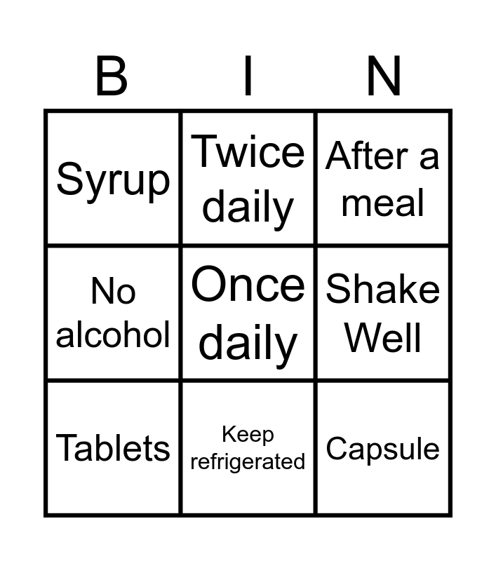 This bingo card has 9 words: Tablets, After a meal, Twice daily, No alcohol, Syrup, Shake Well, Once daily, Capsule and Keep refrigerated.