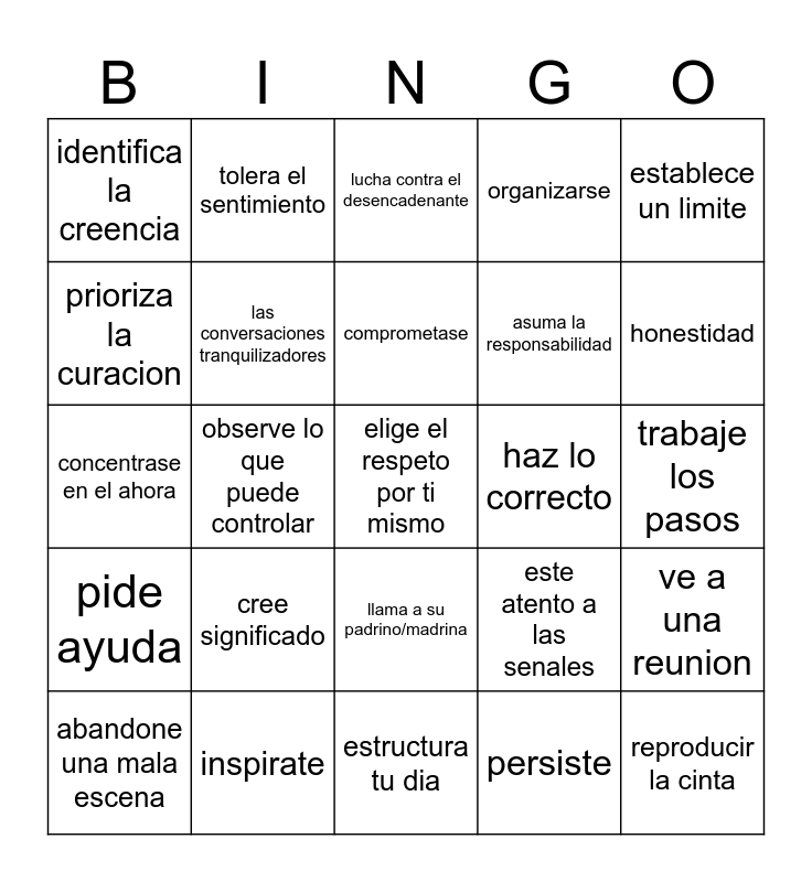 This bingo card has 25 words: pide ayuda, inspirate, elige el respeto por ti mismo, persiste, establece un limite, identifica la creencia, tolera el sentimiento, lucha contra el desencadenante, haz lo correcto, ve a una reunion, prioriza la curacion, las conversaciones tranquilizadores, estructura tu dia, este atento a las senales, honestidad, abandone una mala escena, observe lo que puede controlar, comprometase, asuma la responsabilidad, trabaje los pasos, concentrase en el ahora, cree significado, llama a su padrino/madrina, organizarse and reproducir la cinta.