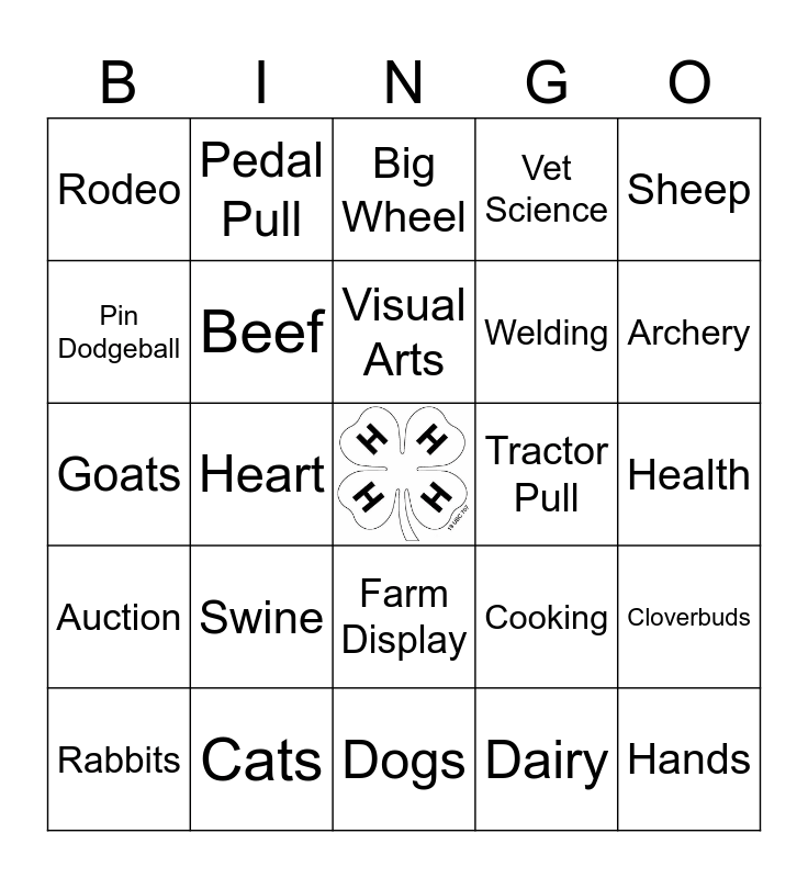 This bingo card has a free space and 28 words: Cloverbuds, Crops, Welding, Dairy, Pin Dodgeball, Big Wheel, Pedal Pull, Auction, Tractor Pull, Rabbits, Goats, Vet Science, Cats, Dogs, Archery, Horses, Swine, Beef, Visual Arts, Farm Display, Rodeo, Head, Hands, Heart, Health, Cooking, Sheep and Poultry.