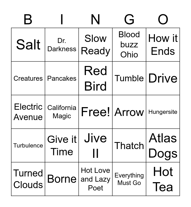 This bingo card has a free space and 24 words: Give it Time, Borne, Red Bird, Turned Clouds, How it Ends, Salt, Creatures, Dr. Darkness, Arrow, Jive II, Tumble, Electric Avenue, Thatch, Atlas Dogs, Pancakes, Everything Must Go, Hungersite, Slow Ready, Drive, California Magic, Hot Tea, Turbulence, Blood buzz Ohio and Hot Love and Lazy Poet.
