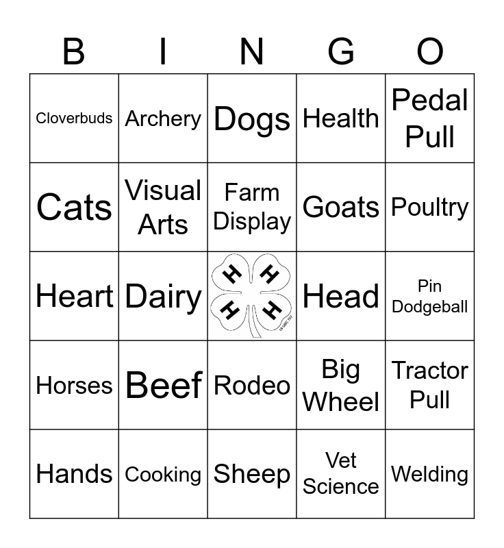 This bingo card has a free space and 28 words: Tractor Pull, Rabbits, Goats, Vet Science, Cats, Dogs, Archery, Horses, Head, Hands, Heart, Health, Cooking, Sheep, Poultry, Swine, Beef, Visual Arts, Farm Display, Rodeo, Cloverbuds, Crops, Welding, Dairy, Pin Dodgeball, Big Wheel, Pedal Pull and Auction.