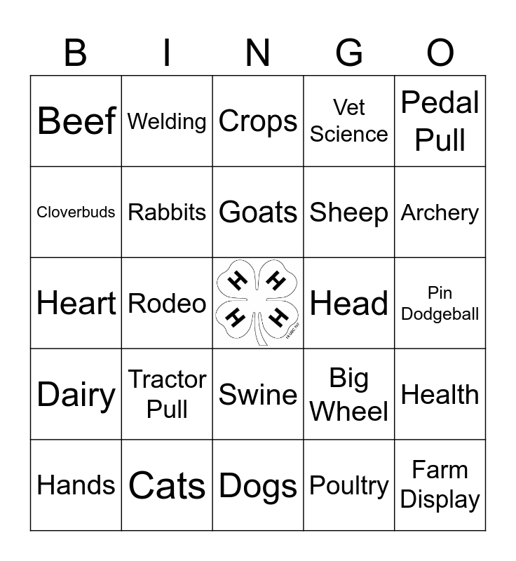 This bingo card has a free space and 28 words: Health, Cooking, Sheep, Poultry, Cloverbuds, Crops, Welding, Dairy, Head, Hands, Heart, Vet Science, Cats, Dogs, Archery, Horses, Tractor Pull, Rabbits, Goats, Swine, Beef, Visual Arts, Farm Display, Rodeo, Pin Dodgeball, Big Wheel, Pedal Pull and Auction.